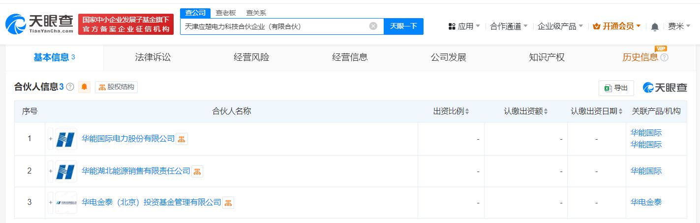 天眼查app显示,近日,天津应楚电力科技合伙企业(有限合伙)成立,执行事务合伙人为华能湖北能源销售有限责任公司,出资额约22.5亿人民币,经营范围为发电技术服务。合伙人信息显示,该合伙企业由华能国际(600011)、华能湖北能源销售有限责任公司、华电金泰(北京)投资基金管理有限公司共同出资。