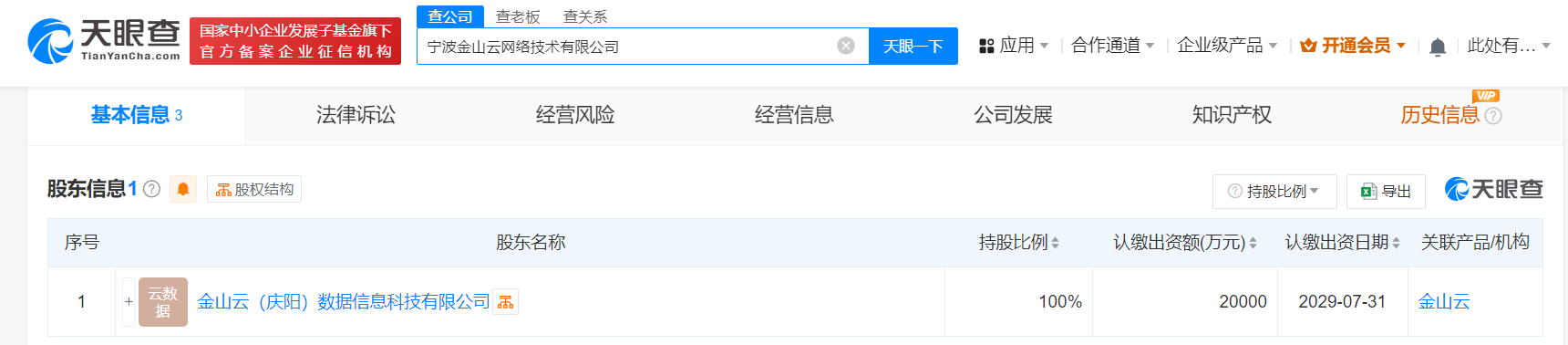 天眼查app显示,近日,宁波金山云网络技术有限公司成立,法定代表人为林劲,注册资本2亿人民币,经营范围含计算机系统服务、软件开发、计算机软硬件及辅助设备批发、计算机软硬件及辅助设备零售、软件销售、云计算设备销售、计算机及通讯设备租赁等。股东信息显示,该公司由金山云(庆阳)数据信息科技有限公司全资持股,后者为北京金山云网络技术有限公司全资子公司。