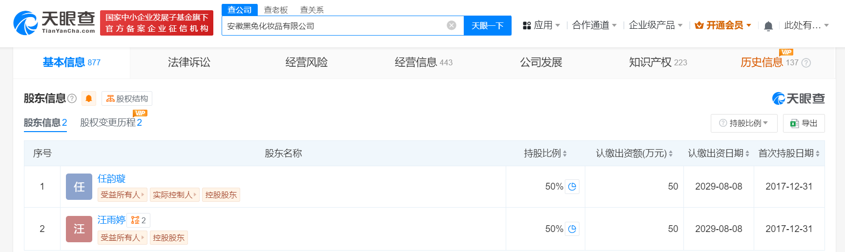 天眼查app显示,“HYNTOOR黑兔”关联公司安徽黑兔化妆品有限公司成立于2017年8月,法定代表人为任韵璇,注册资本100万人民币,经营范围包括香水和化妆品零售、化妆品及卫生用品批发等,由任韵璇、汪雨婷共同持股。年报信息显示,该公司2023年参保人数为5人。知识产权信息显示,该公司已申请注册多枚“黑兔彩妆”“HYNTOOR”“黑兔”文字和图形商标,此外,该公司还登记了多个“黑兔”相关美术作品著作权。双随机抽查信息显示,2018年6月,该公司被检查出通过登记的住所(经营场所)无法联系。资质证书信息显示,该公司多个国产非特殊用途化妆品备案为注销完成状态。