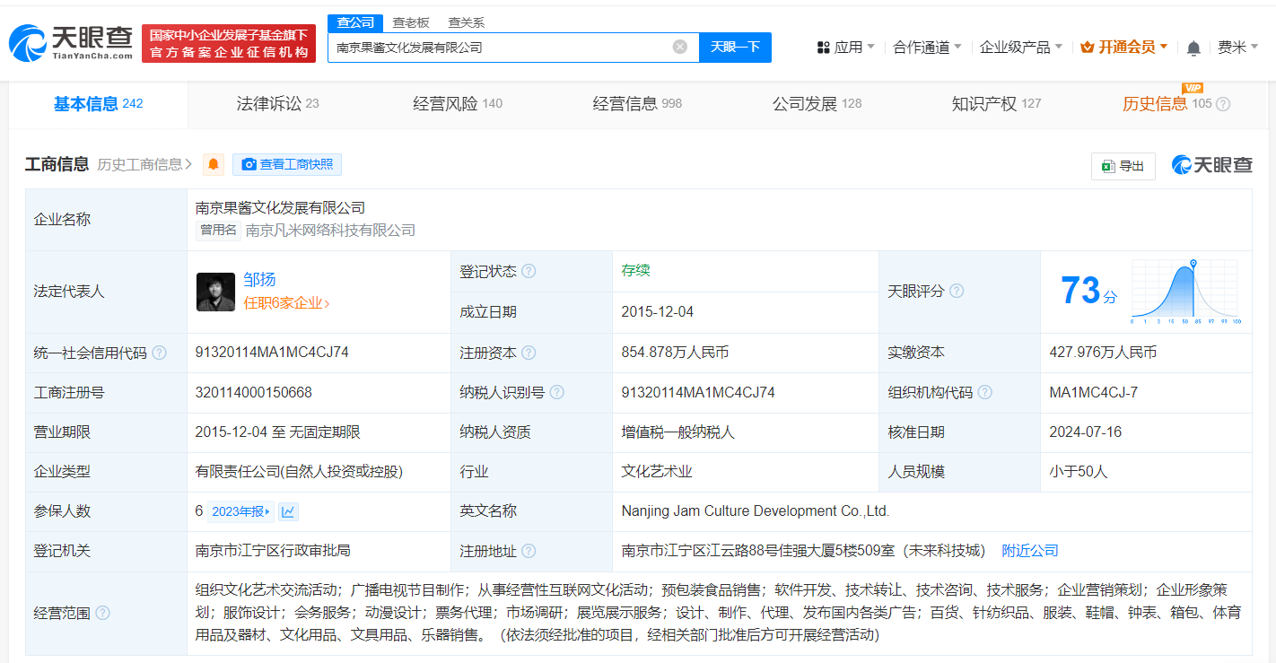 天眼查法律诉讼信息显示,9月2日,南京果酱文化发展有限公司新增一则被执行人信息,执行标的5518元,执行法院为南京市雨花台区人民法院。