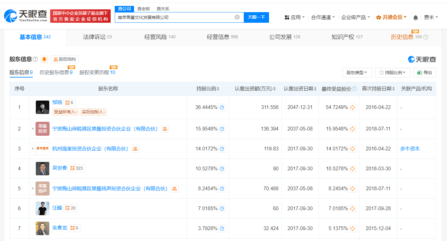 南京果酱文化发展有限公司成立于2015年12月,法定代表人为邹扬,注册资本约854.88万人民币,经营范围含组织文化艺术交流活动、广播电视节目制作、从事经营性互联网文化活动、企业营销策划、服饰设计、动漫设计、票务代理等,由邹扬、宁波梅山保税港区果酱投资合伙企业(有限合伙)、汪峰等多位股东共同持股,其中汪峰持股约7%并担任公司董事。公开信息显示,果酱文化是一家以音乐和粉丝经济为核心的内容及消费平台。