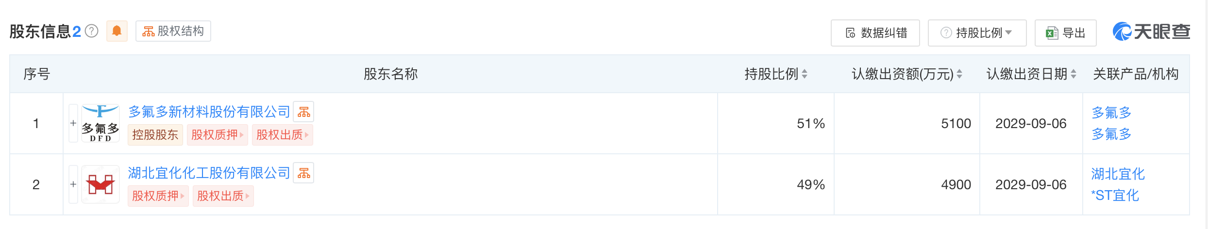 天眼查app显示,近日,湖北氟硅宜成新材料有限公司成立,法定代表人为李文明,注册资本1亿人民币,经营范围含专用化学产品制造、专用化学产品销售、电子专用材料制造等。股东信息显示,该公司由多氟多(002407)、湖北宜化(000422)共同持股。