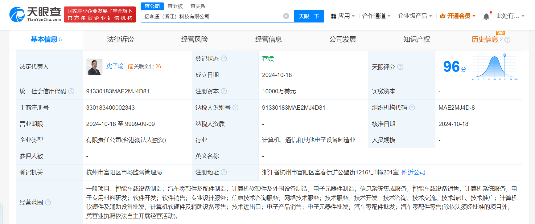 天眼查app显示,近日,亿咖通(浙江)科技有限公司成立,法定代表人、董事、经理为沈子瑜,注册资本1亿美元,经营范围含智能车载设备制造、汽车零部件及配件制造、计算机软硬件及外围设备制造、电子元器件制造、信息系统集成服务、智能车载设备销售等,由ECARX Technology Limited全资持股。