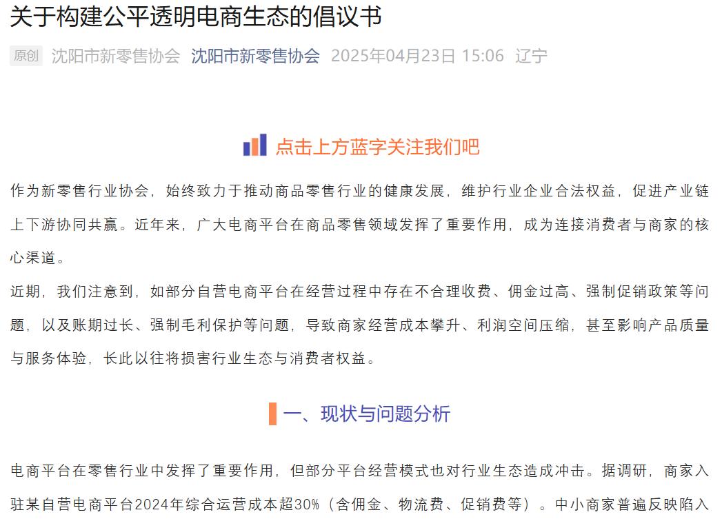 4月23日,沈阳市新零售协会公众号发布《关于构建公平透明电商生态的倡议书》(下简称“倡议书”),称部分自营电商平台存在不合理收费、佣金过高、强制促销政策等问题,以及账期过长、强制毛利保护等,导致商家经营成本攀升、利润空间压缩,甚至影响产品质量与服务体验。