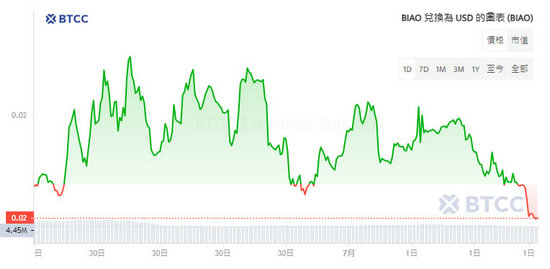 截止7 月1 日,BIAO 的交易价格为$0.02057,在过去24 小时上涨了41.20%,最高达到$0.02247。