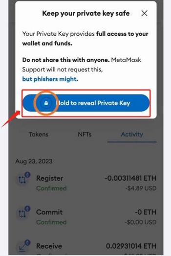 5、单击并按住“按住以显示私钥”以显示您的私钥。